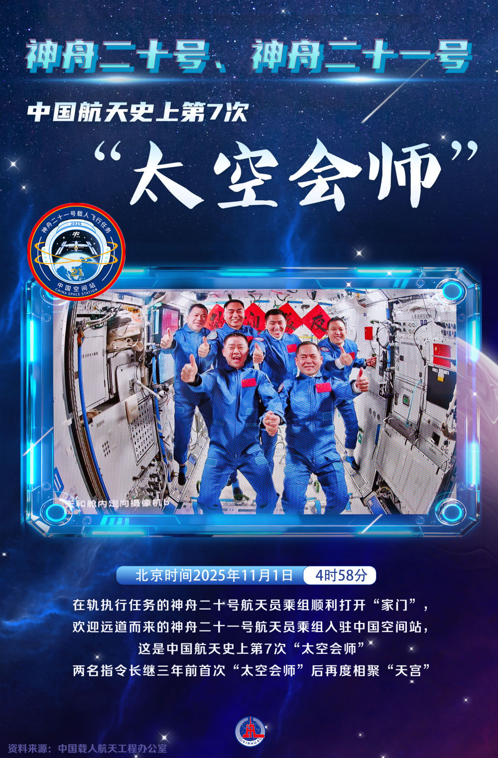 北京时间2025年11月1日凌晨4点58分,执行在轨任务的20名神舟航天员和机组人员成功开启“家”,迎来远道而来的21名神舟航天员落户中国空间站。这是中国航天史上第七次“航天会议”。两国领导人继三年前首次“太空会谈”后再次在天宫会面。随后,两位宇航员拍了一张“全家福”,共同向全国有关人士通报了他们的安全情况。设计:崔文 策划:李真、刘谦、陈聪英