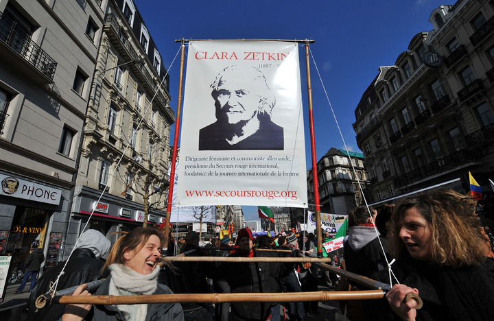 2010年3月6日,在比利时首都布鲁塞尔庆祝国际妇女节的游行中,妇女代表举着著名政治活动家、国际妇女节倡导者克拉拉·蔡特金的肖像。新华社记者吴伟 供图