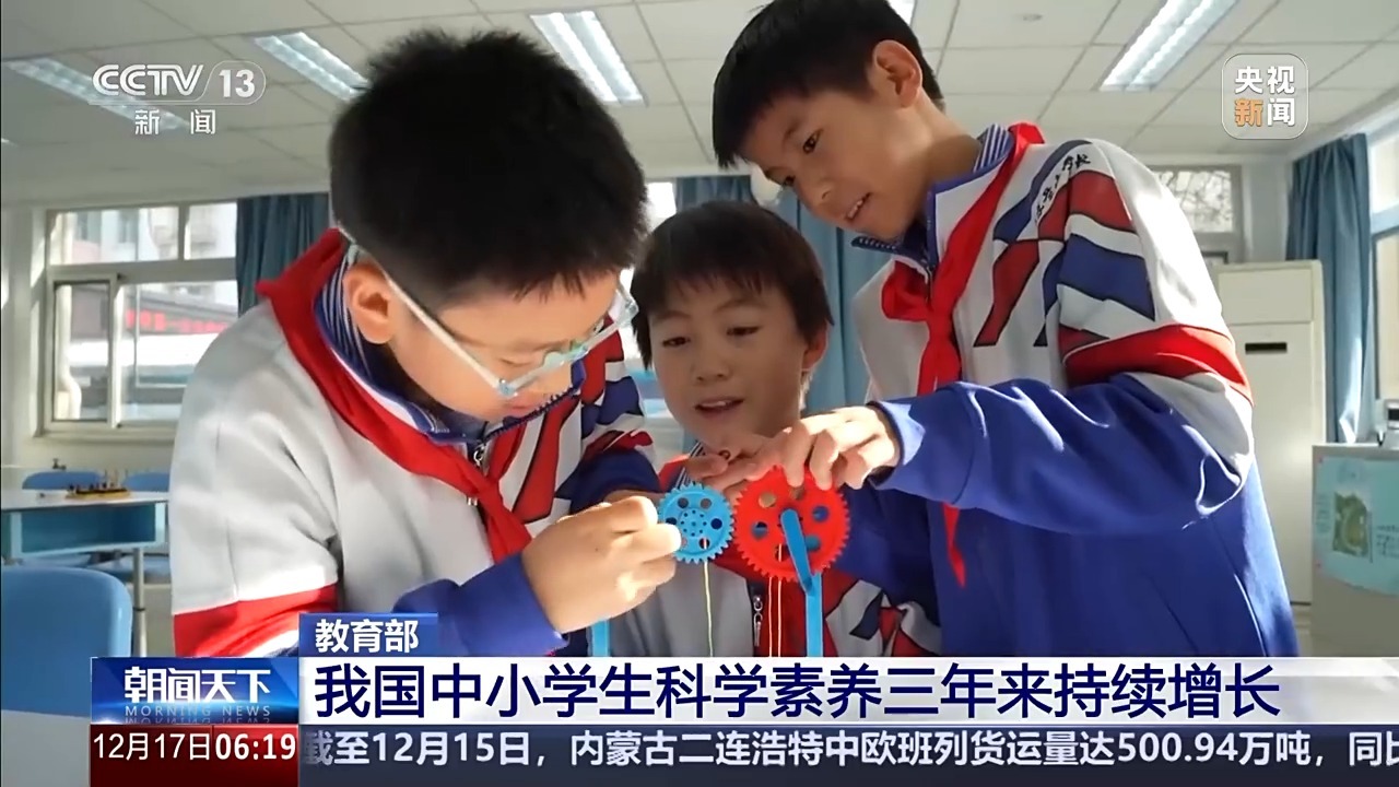 教育部有关负责人介绍,全国中小学生科学素养调查结果显示,到2025年,各年级中小学生科学素养平均分预计比2024年提高4.5%,比2023年提高6.3%。近三年来,我国中小学生科学素养逐步稳步提升。