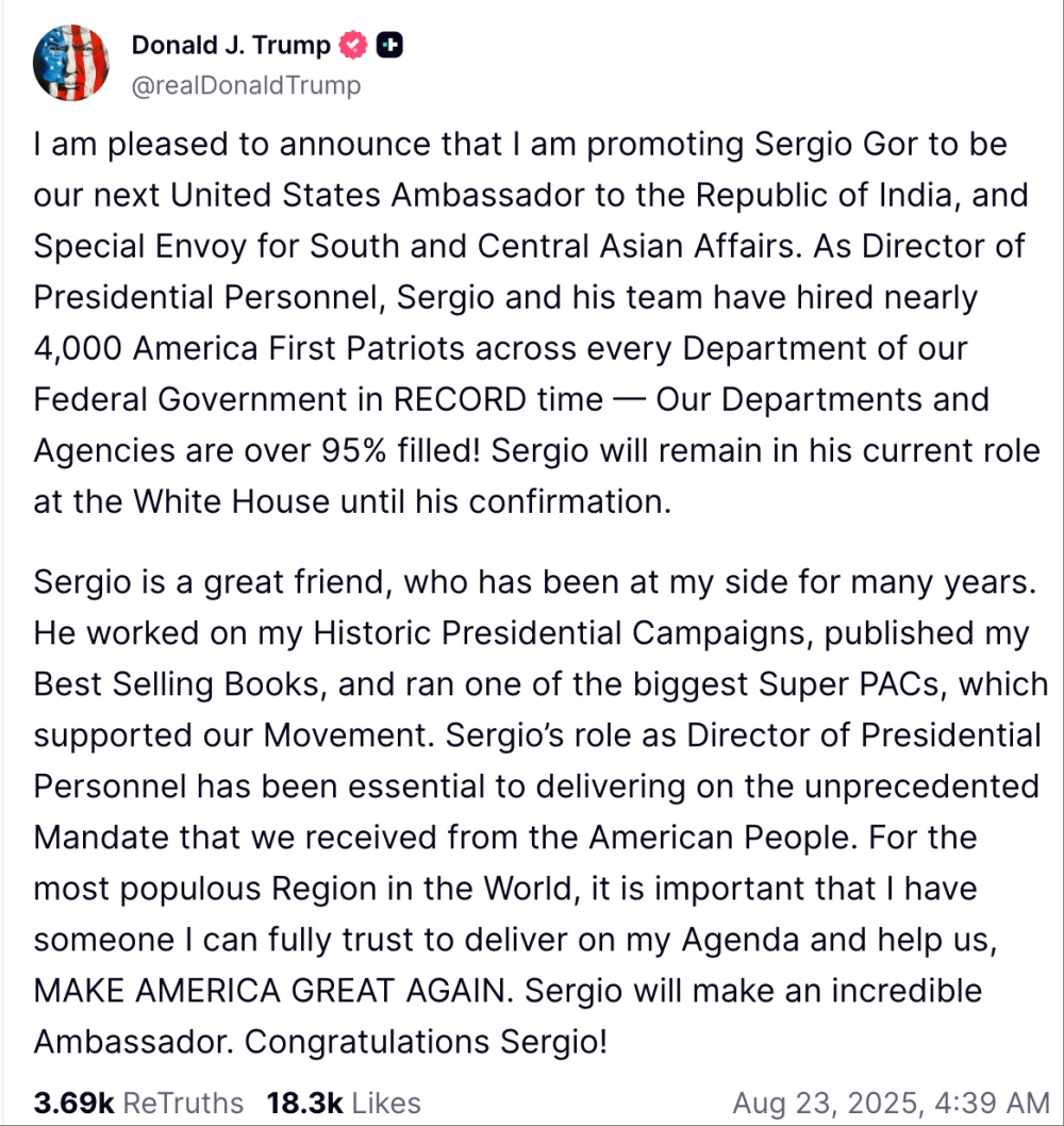 - 阅558月22日,特朗普总统宣布了当地时间,该时代将命名白宫人力资源总统塞尔吉奥·戈尔(Sergio Gore)担任印度的美国。......